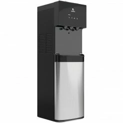 Water cooler is bottom loading to eliminate the strain of lifting, reduce spills and is suitable for 3-5 gallon water bottles (BOTTLE NOT INCLUDED)