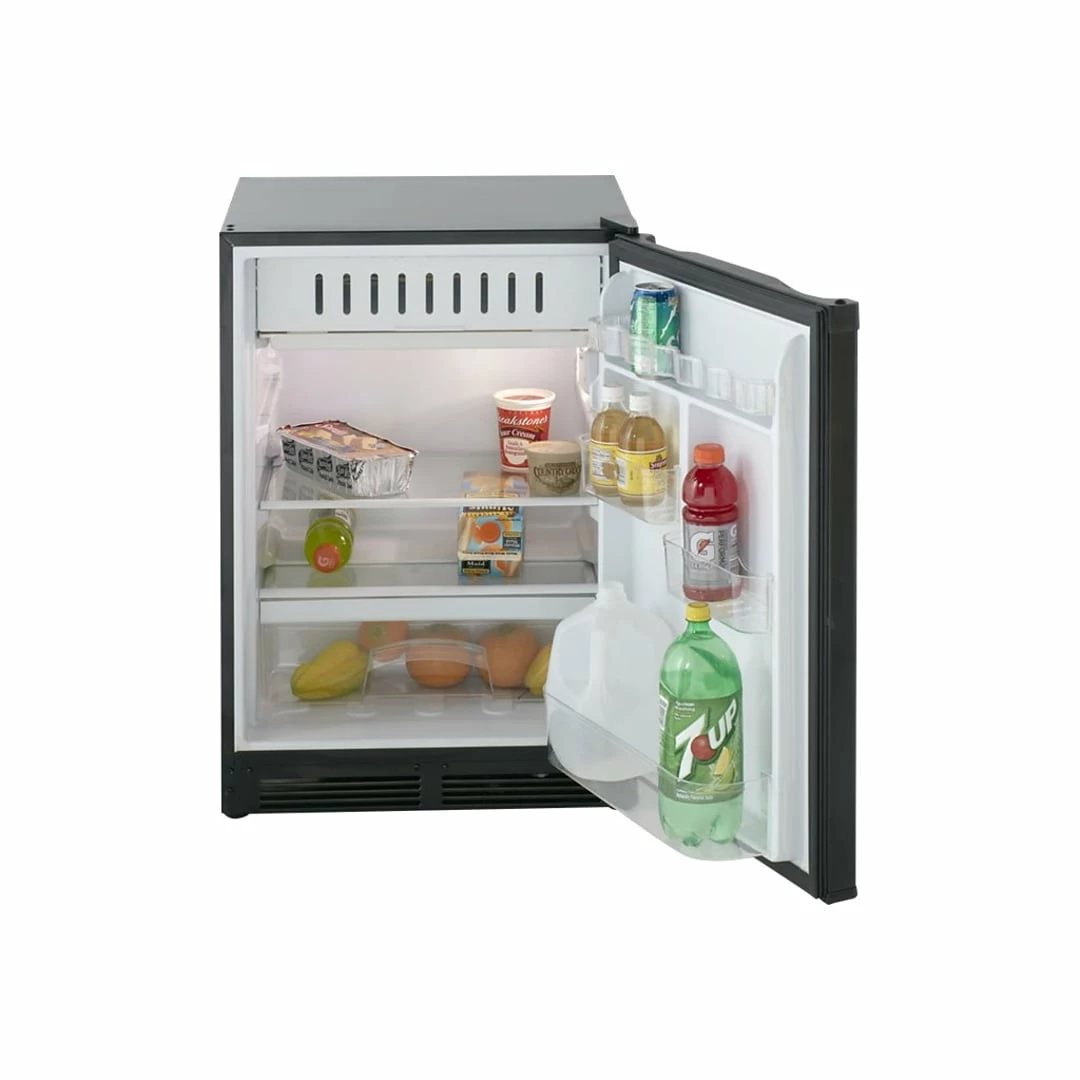 Ensure guests, colleagues, or visitors have access to chilled food and drinks using this counter-high refrigerator. The 5.2-cubic-foot capacity lets you keep a range of cans, drinks, and basic food products cool, while the full-width crisper drawer allows you to store fruit and vegetables at an optimum temperature. Integrated can storage provides room for six cans, and the gallon-jug storage in the door makes it easy to keep milk fresh, ideal for hotel rooms and small entertainment rooms. Thanks to an adjustable thermostat control, this refrigerator can go from keeping vegetables at the ideal temperature to keeping meat as cool as possible. An interior LED light makes it easy to see within without heating up the inside, while the reversible door is simple to alter as needed. This Avanti 5.2-cubic-foot counter-high refrigerator has adjustable legs, so that you can keep everything level.
