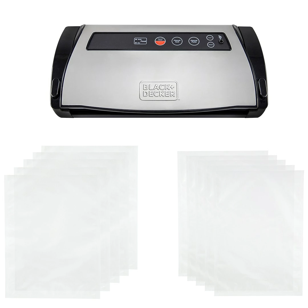 It includes a Premium Vacuum Sealer, 50 Count 11-Inch x 16-Inch Vacuum Sealer Bags, and 50 Count 8-Inch x 12-Inch Vacuum Sealer Bags. The BLACK+DECKER Premium Vacuum Sealer protects against freezer burn and keeps food fresh up to 5x longer than traditional methods. Multiple push-button functions give you the ability to choose what settings work best for the food you are sealing, which is great when preserving a wide variety of food items. The dry/moist function allows you choose between different food types and pulse mode lets you control the pressure when it comes to sealing delicate food items. Eliminate freezer burn, reduce spoilage and waste! These vacuum sealer bags are designed to lock freshness and flavor in and keep air, moisture, and odors out. The multi-layer construction is tear-resistant and is designed to perform at extreme temperatures.