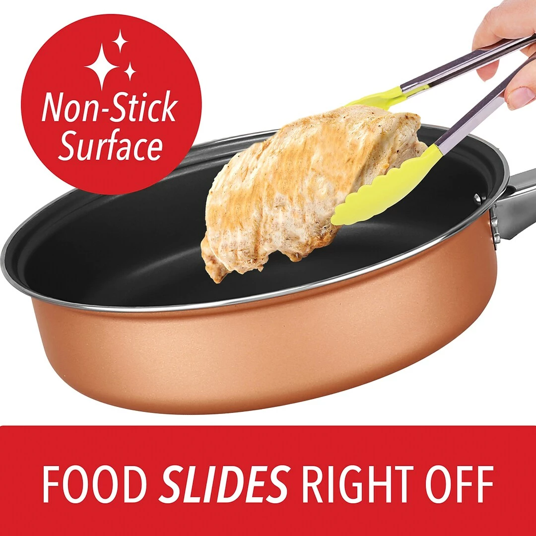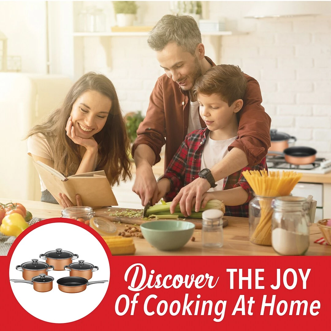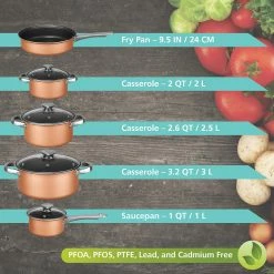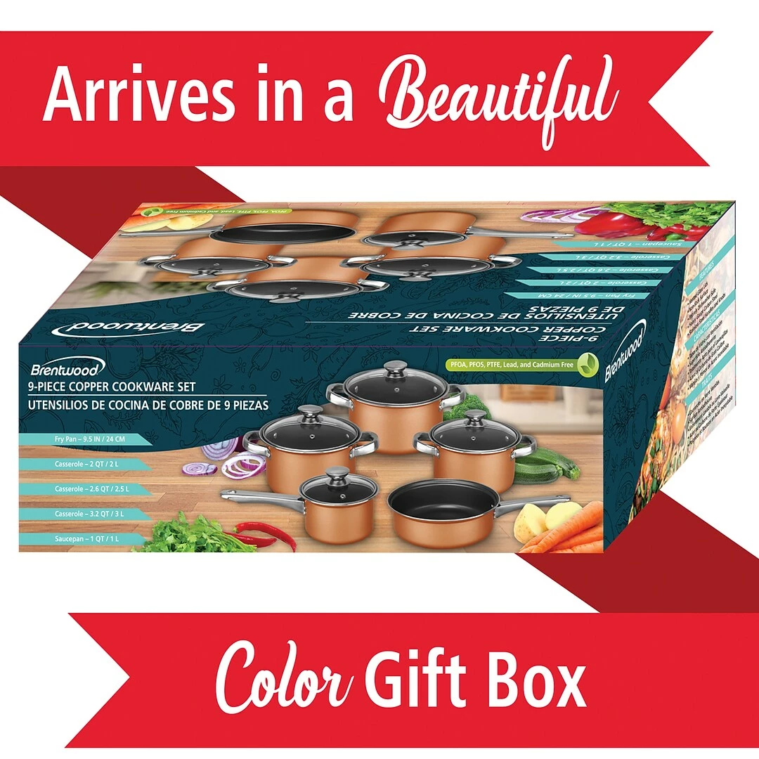 Use the Brentwood 9-Piece Nonstick Copper-Clad Cookware Set with Glass Lids to fry, boil, saute, and braise. Food slides right off thanks to the exceptional nonstick surface. This set includes 9.5 in. fry pan, 1 qt. saucepan with lid, and two 2.6 qt. and one 3.2 qt. casserole pans. Comfortably handle the cookware with the help of ergonomic handles and lightweight construction. The beautiful copper cookware set adds a modern aesthetic to your kitchen. Safely cook food with the PTFE-, PFOA-, PFOS-, lead-, and cadmium-free cookware set. Simply place everything in the dishwasher for effortless cleanup.