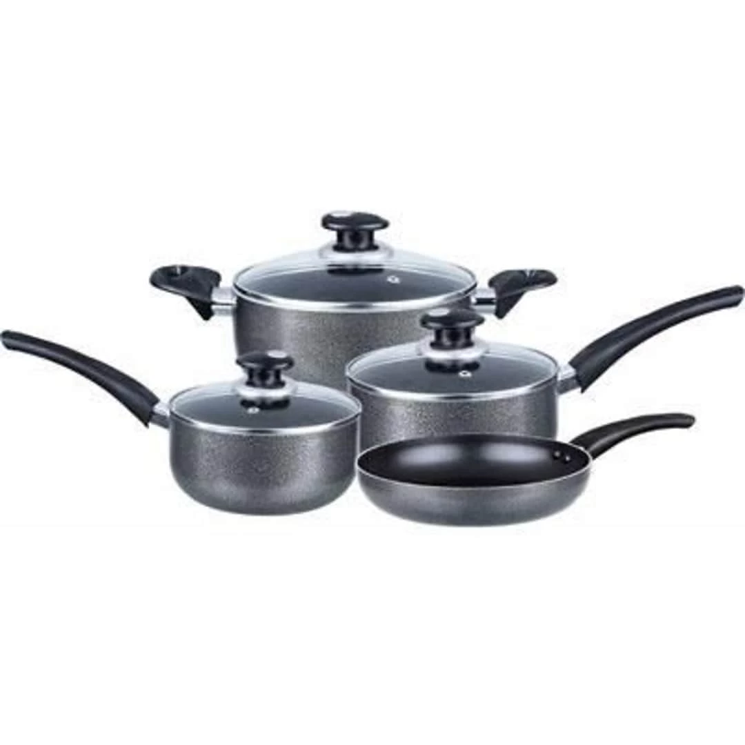 The Brentwood BPS107 gray 7-piece aluminum cookware set features two-layered non-stick coating interior as well as durable granite finish exterior. Dishwasher safe cookware set has durable heat-resistance handles and knobs for confident grip.