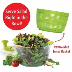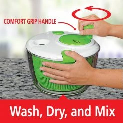 Easy-to-use salad spinner has 5-qt. serving bowl and mess-free locking lid