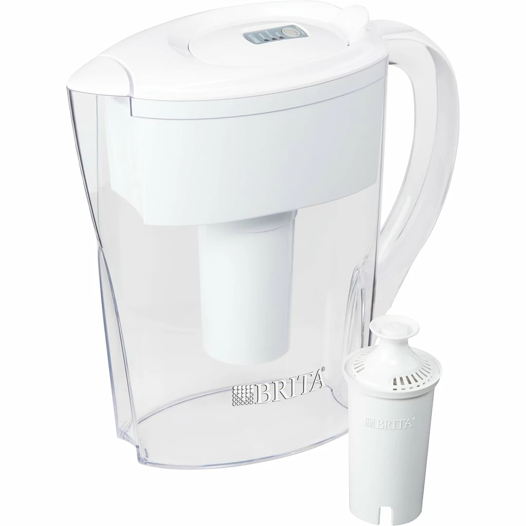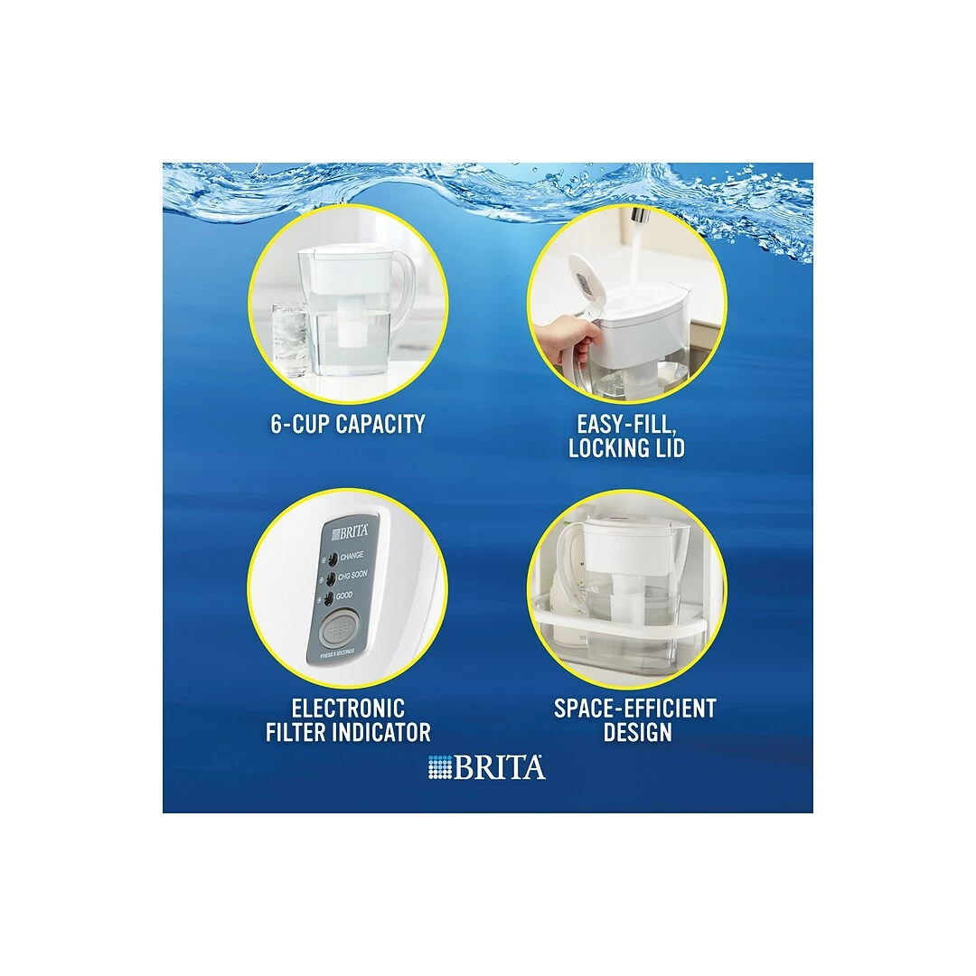 With the Brita 6 Cup Space Saver Water Filter Pitcher, it is easy to drink healthier, great tasting water. Using technology which combines coconut-based activated carbon with ion exchange resin, the Brita advanced filter reduces the taste and odor of chlorine to deliver great tasting water while removing copper, mercury and cadmium impurities that can cause illness over time. The Brita Space Saver Pitcher is BPA-free and comes with an electronic filter indicator which notifies you when it is time to replace your filter. Change your filter every 40 gallons or approximately every two months. The small, 6 cup capacity makes this pitcher perfect for kitchen and office refrigerators. Ergonomically designed, this water filter pitcher features a flip top lid for no fuss refilling and a comfort grip handle for easier pouring. By drinking filtered water, you are reducing the amount of plastic bottles that end up in our landfills and oceans. One Brita water filter used equals 300 plastic bottles saved. Ideal for use in offices, schools, daycare centers, restaurants, hotels and other commercial facilities. Start drinking healthier, great-tasting water with Brita today.