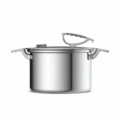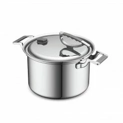 This CookCraft 8 qt. saucepan with a strainer and a latch-lid is perfect for pasta, soups, sauces, and more without a mess on your counter. The fitted lid has a vent for steaming and a latch handle that rests on the side of the skillet. The tri-ply construction with an aluminum core that distributes the heat evenly.