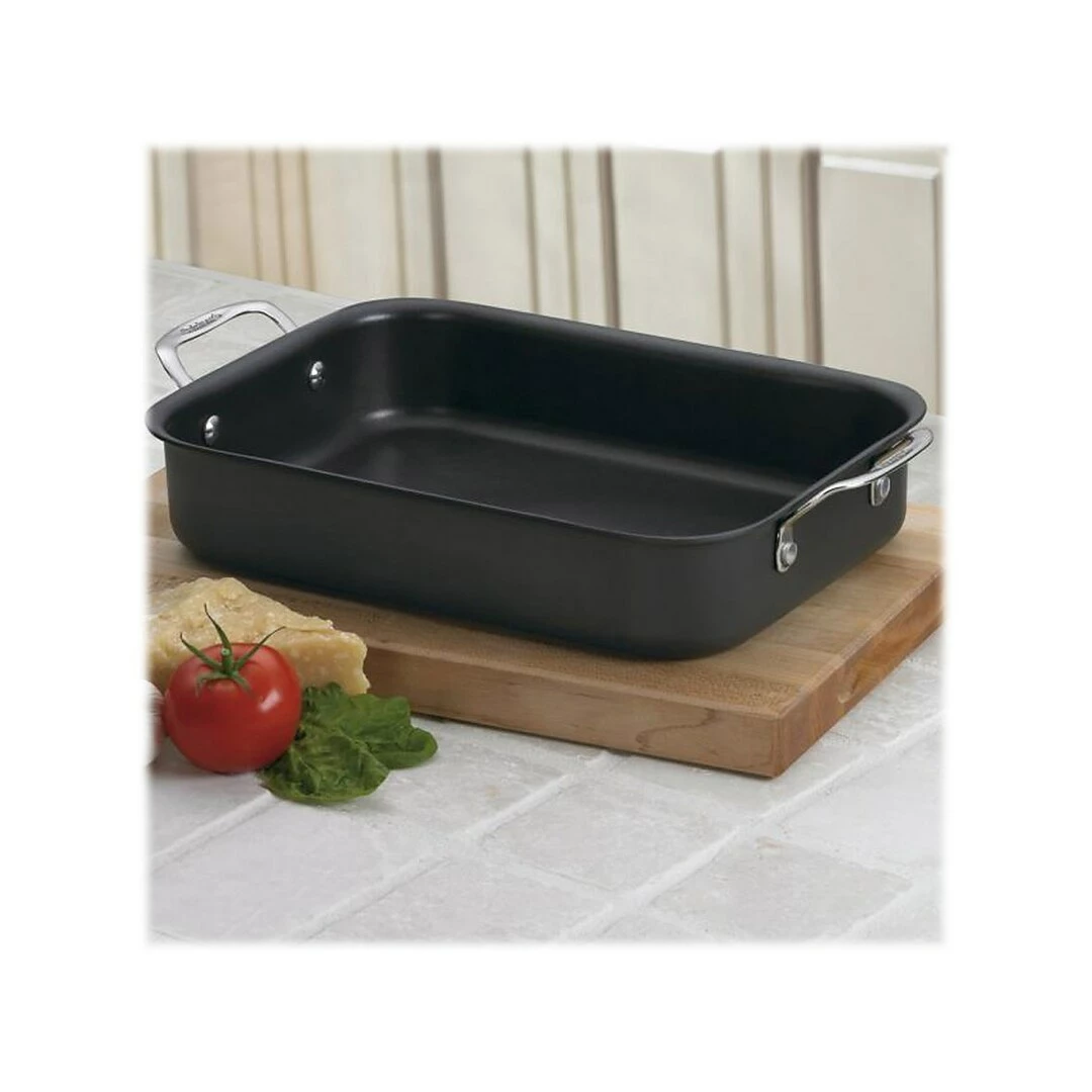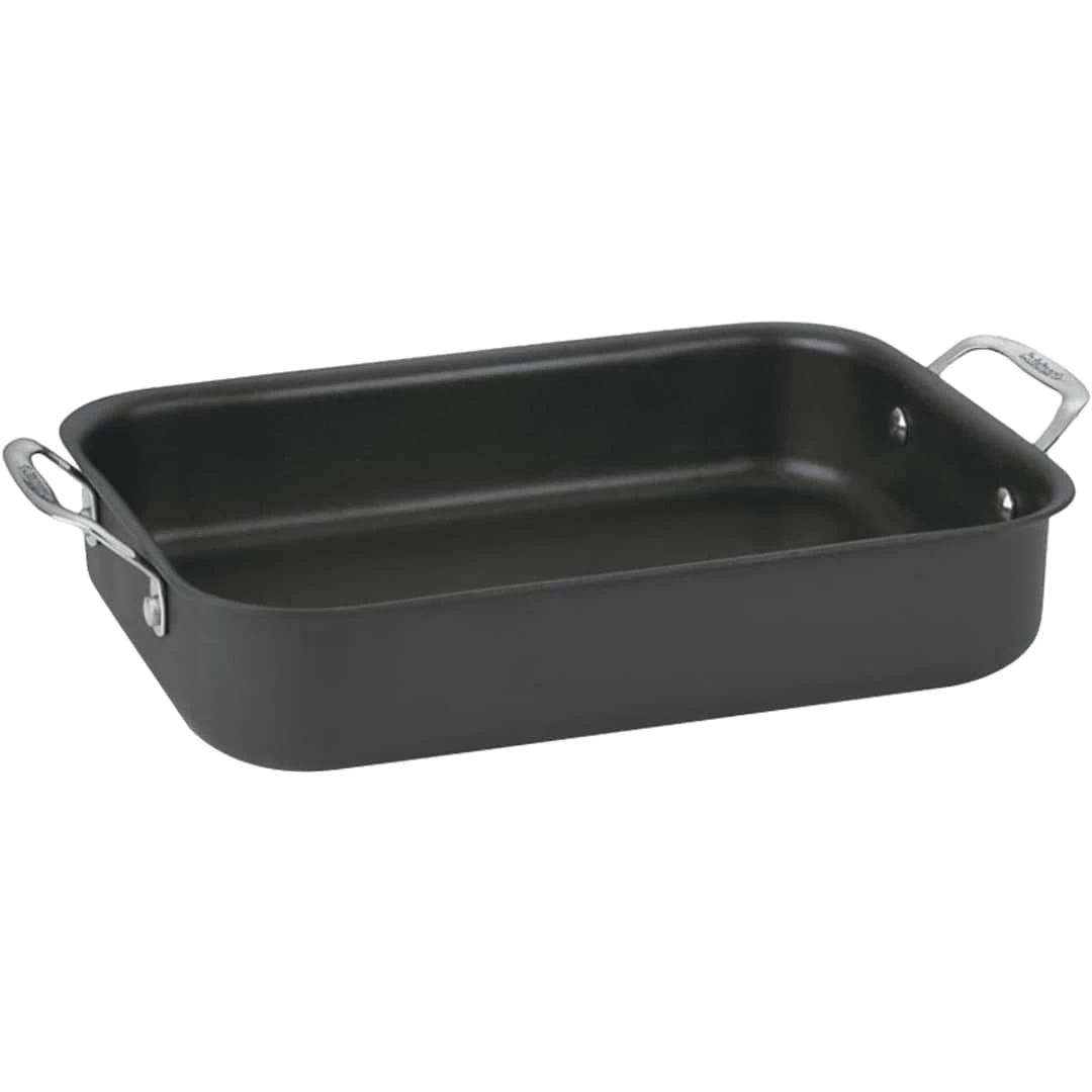 Cook and serve lasagnas, casseroles, and roasts. The Cuisinart Chef’s Classic nonstick hard-anodized lasagna pan has high sides and a wide, flat bottom. The open design of the 14″ lasagna pan maximizes the cooking surface and makes it easy to layer your ingredients for a delicious dinner. The QuanTanium nonstick cooking surface is reinforced with titanium for lasting food release, healthy cooking, and easy cleanup.