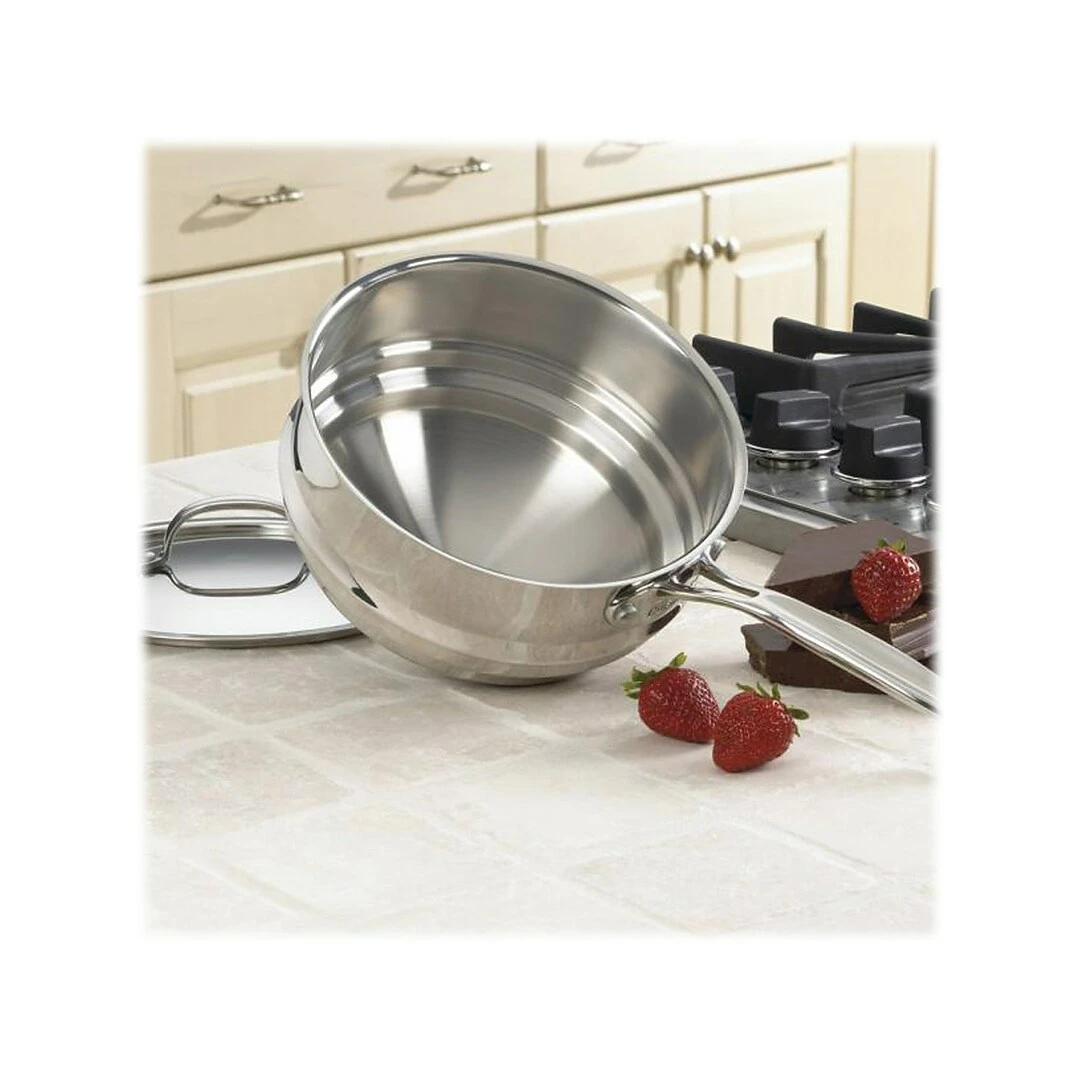 The Cuisinart rounded design of the stainless steel universal double boiler facilitates easy whisking while slowly cooking delicate butter-, egg-, or cream-based sauces. This stainless steel double boiler fits 2-, 3-, and 4-quart saucepans.