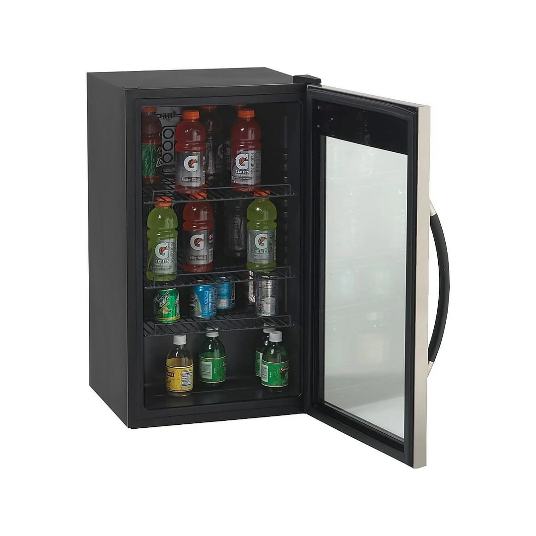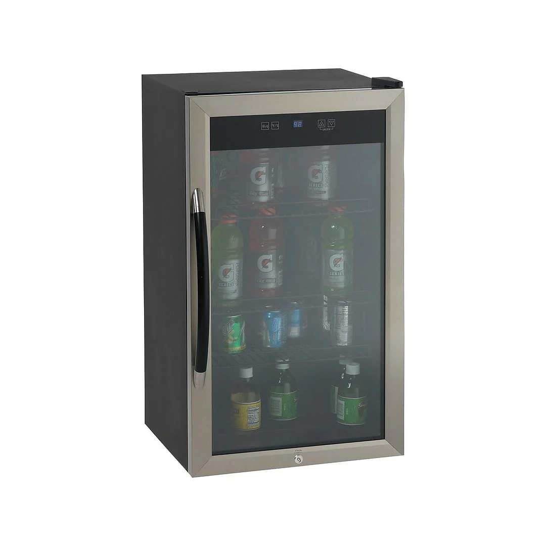 Outfit your office, break room, cafeteria or other shared space with this beverage cooler. Three adjustable, removable shelves let you customize the interior to hold bottles or cans, and the built-in light illuminates the interior for better visibility. A clear front panel lets you see what’s stored inside without having to open the door, preventing fluctuations in temperature. Use the soft-touch control panel and LED display to monitor and adjust the conditions inside this beverage cooler. A handy security lock prevents access as needed, and a sleek handle allows for effortless opening and closing. This beverage cooler features a black and stainless steel color scheme, making it a handsome option for customer-facing placement. With its compact footprint, this Avanti 3.0-cubic-foot beverage cooler fits neatly next to a desk or on a counter for flexible placement options.