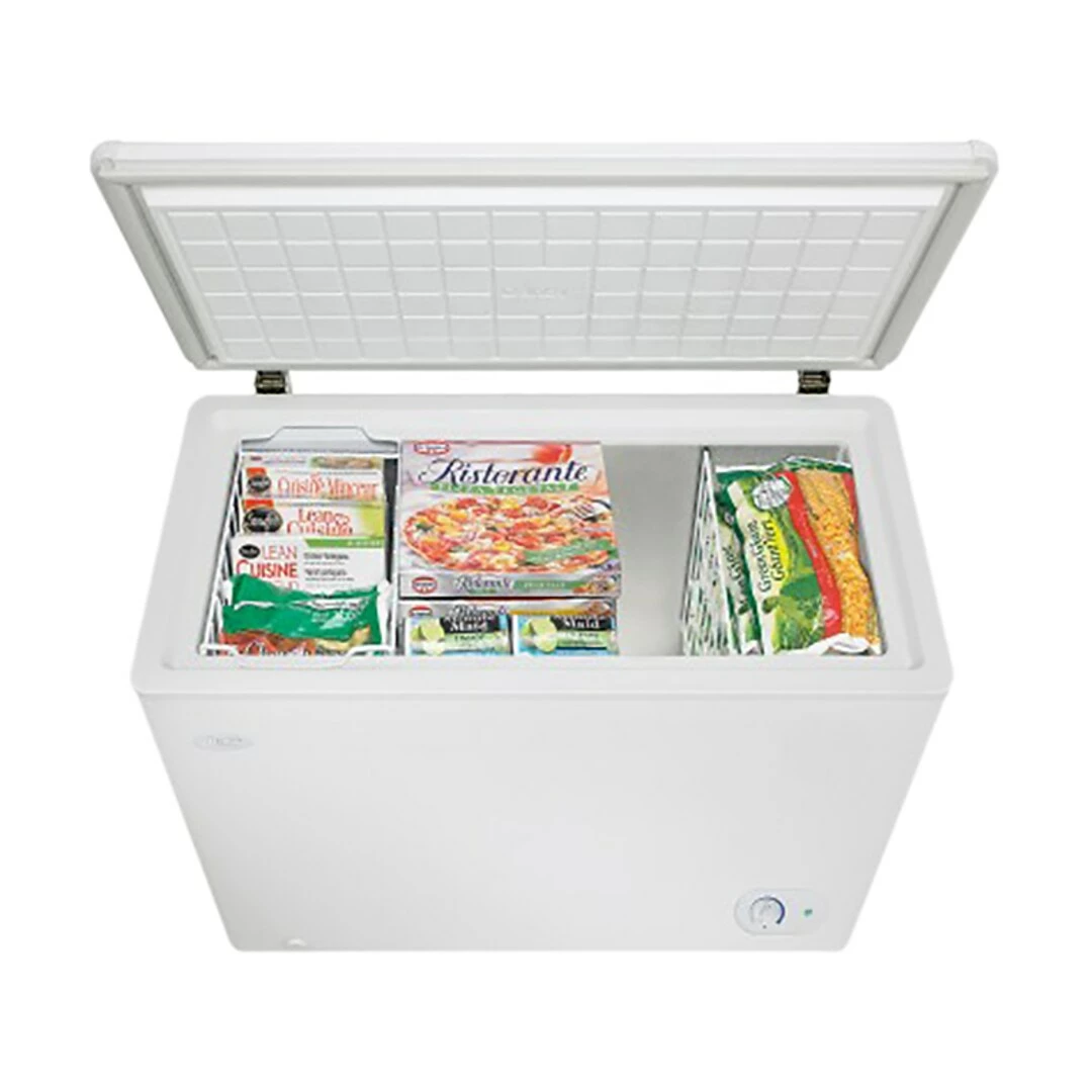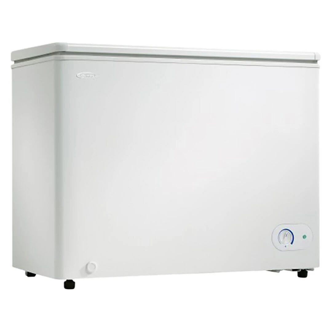This dependable chest freezer by Danby is the perfect addition to any type of household or cottage. Your electricity bills will be noticeably reduced due to the efficient, smart foam-insulated cabinet and rounded lid. The easy-to-access front-mounted mechanical thermostat allows you to easily and quickly program the unit to the desired temperature. This popular model comes with a convenient manual defrost system and drain along with a strong vinyl-coated basket to separate and store your most popular foods.