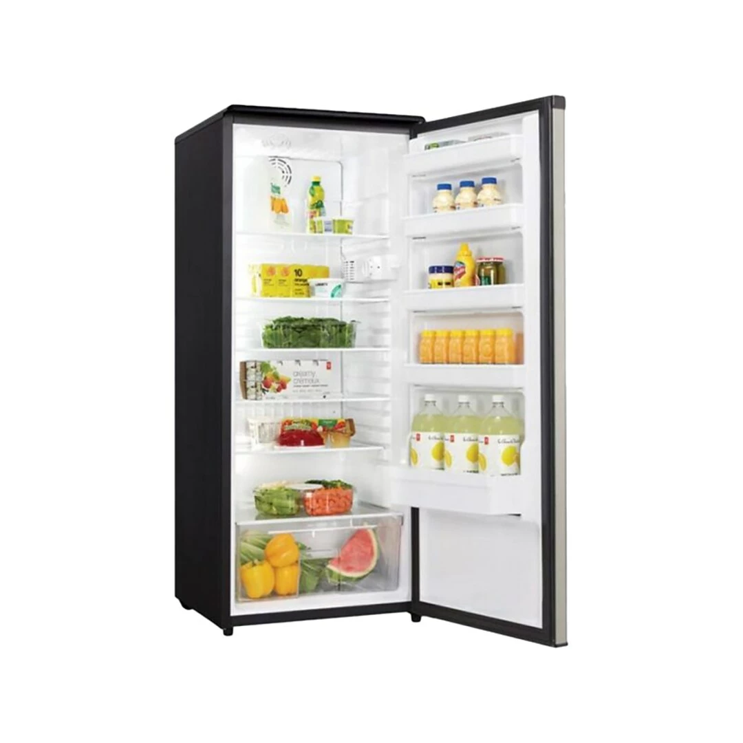 The stylish appliance features a single door with an integrated handle and clever reversible hinge, which allows you to set it for right- or left-hand opening. The neat and tidy Danby Designer interior is illuminated with a powerful lighting system, which makes it easy to organize the glass-covered vegetable crisper, integrated door shelves, and four and a half adjustable glass shelves.