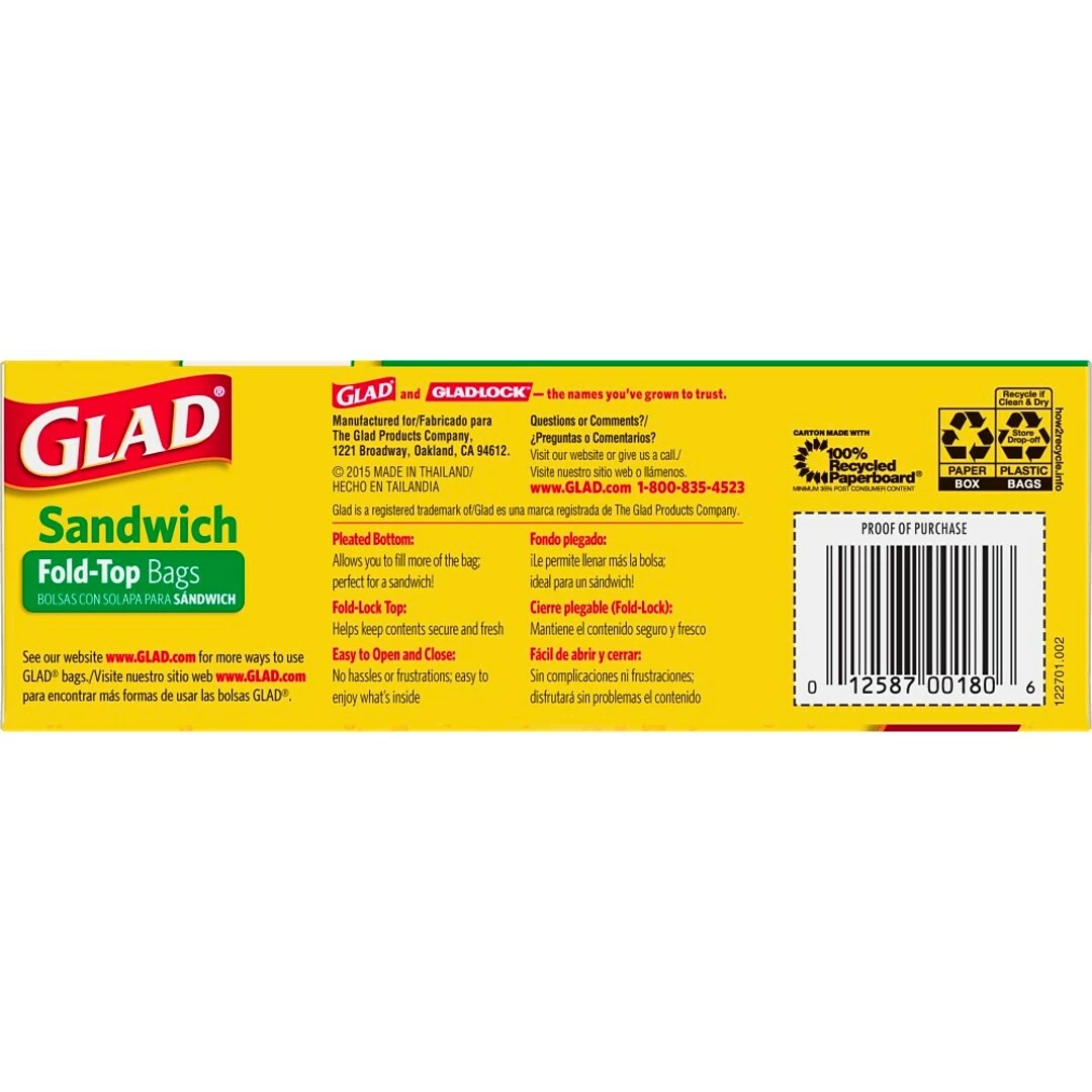 Glad food storage bags with sandwich fold top are just the right size for storing or taking small items on the go. These multipurpose bags are not just for lunch though. Bags are the perfect size for packing snacks for school, keeping small travel items together, or saving cut fruits and veggies. These bags have pleated bottoms, which allow you to fill the bag with more. The fold lock top helps to keep your food fresh and items secure, but are still easy to open and close without frustration. Bags are BPA free and microwave safe. Ideal for use in schools, daycare centers, restaurants, hotels and other commercial facilities.