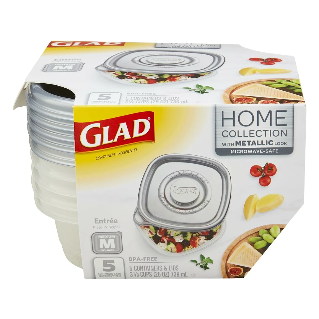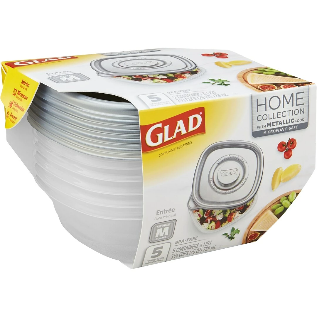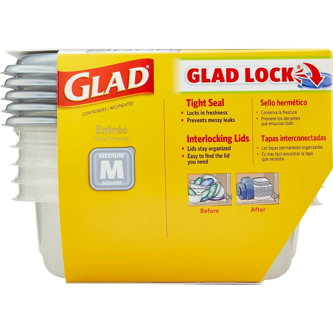 Prevent contamination of stored foods with these plastic containers. The lids seal tightly to prevent spills and protect the contents from the elements, while interlocking stacking enables you to save on storage space. With BPA-free plastic construction, these storage containers keep your food free of contaminants. Microwave-safe, heating food in these Glad Home Collection entree plastic containers is a sound option.