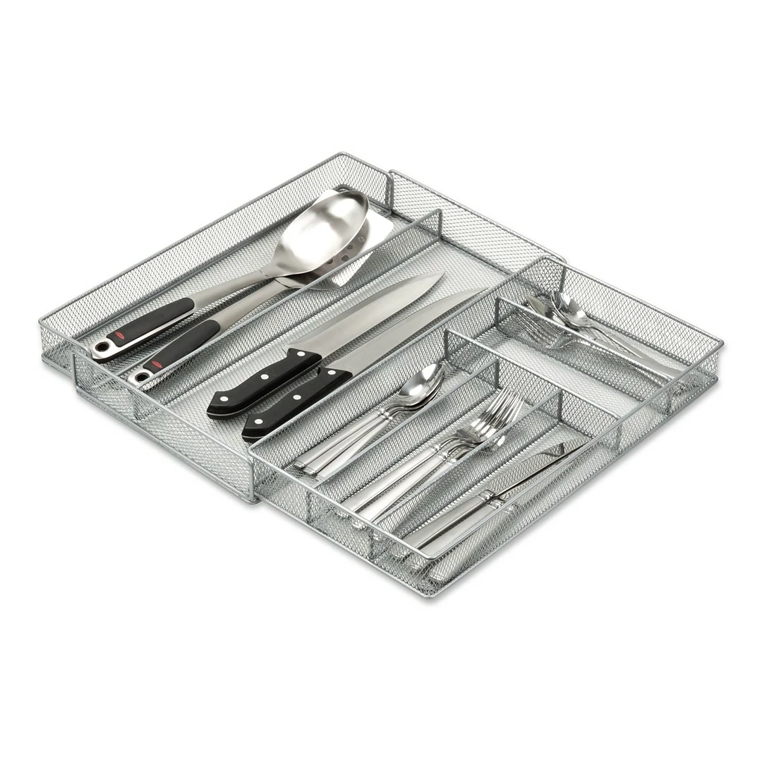 Honey Can Do® Expandable cutlery utensil steel mesh drawer organizer in silver color has steel mesh construction which is durable and scratch resistant. Organizer with 7 compartments has a dimension of 2″ x 20 1/4″ x 16 1/2″.