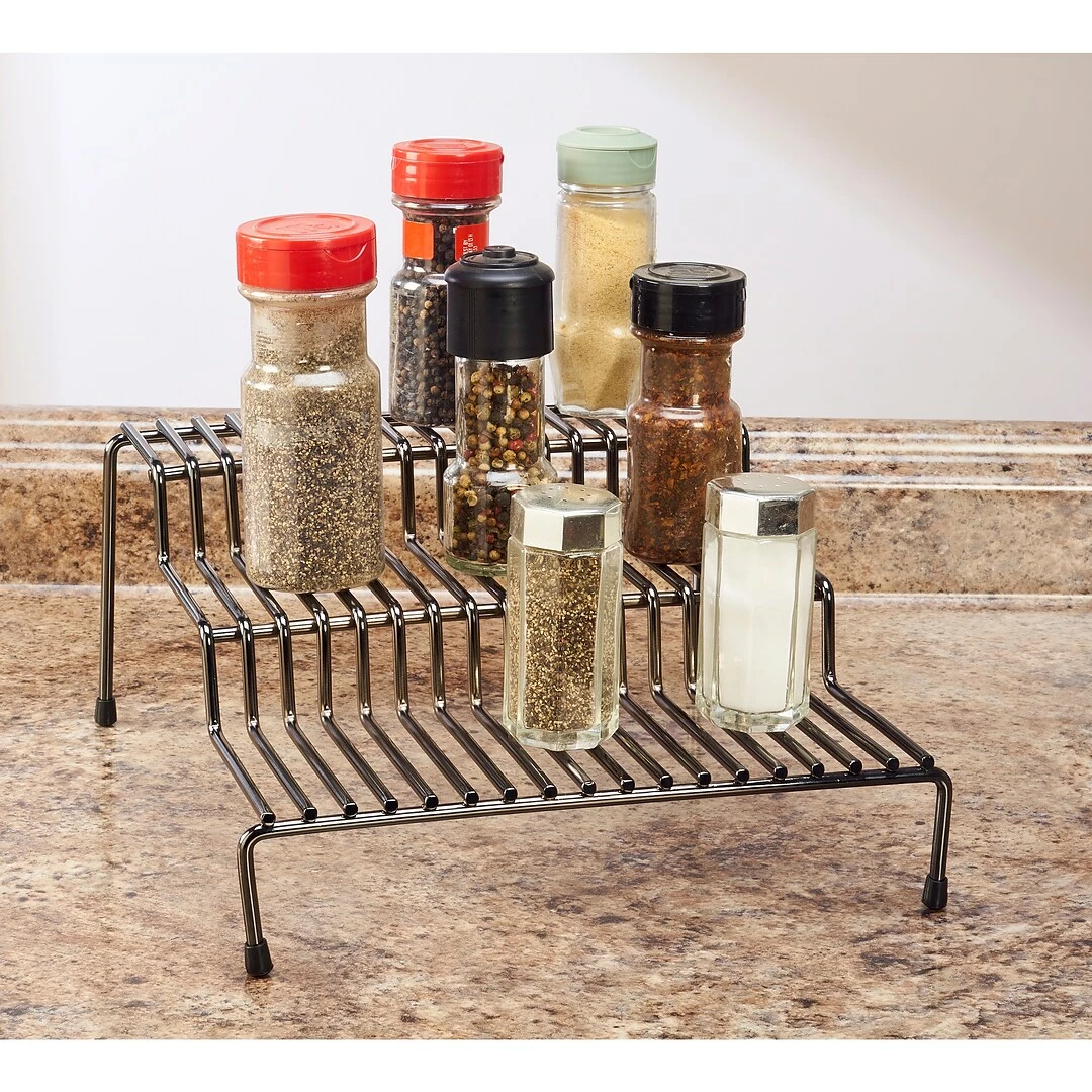 Utilize the space you have in your cabinet to the fullest by keeping spice bottles all in one place with this 3-Tier spice rack organizer. Can be used on a counter top or cabinet. Rust resistant material creates longevity and the non-marring feet protectors prevent scratching.