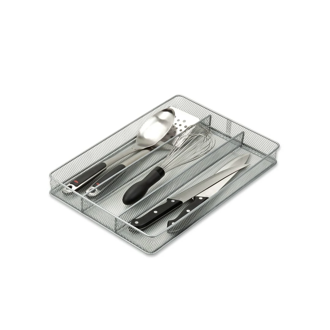 Sort flatware, utensils and other essentials with this Honey-Can-Do three-compartment mesh drawer organizer. The long, narrow compartments accommodate a wide array of items, from dinner forks to whisks, and the mesh design has a modern look. This Honey-Can-Do three-compartment mesh drawer organizer features steel construction, so it stands up to frequent use in your busy break room or on a quick-service counter.