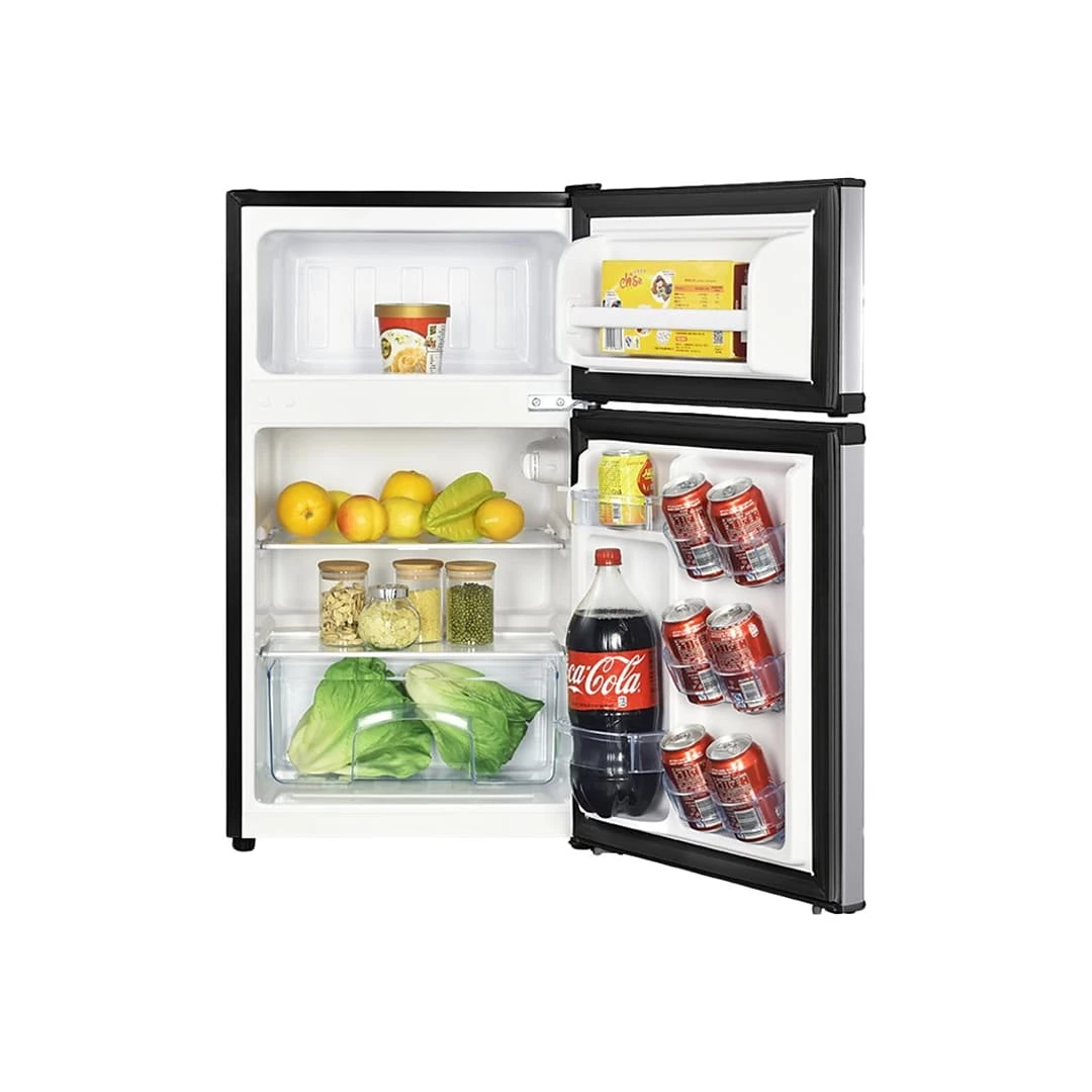 Refrigerator features one 2L bottles storage door compartment, three can racks, and one clear crisper to maximize space and organize groceries