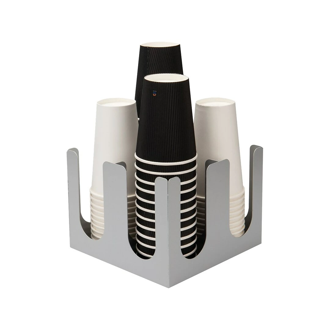 Stack up multiple plastic or paper cups per section on this specially designed cup and/or lid holder for a unique arrangement that helps clear up clutter
