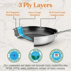 NutriChef’s 8 In. Nonstick Tri-Ply Stainless Steel Stir Fry Pan with Glass Lid is PFOA/PFOS-free. The nonstick 8 in. stir fry pan features a long-lasting DAKIN etching nonstick coating inside and outside for easy food release or tossing, cleaning, and healthy cooking. The stainless steel cooking pan features a raised-up honeycomb fire textured pattern that forms an outstanding scratch-resistant surface so it is safe to use metal utensils. Nutrichef stainless steel cookware is made with tri-ply composite structure-aluminum core fuses between 2 layers of stainless steel for quick and even heat transfer for even cooking all-around. Oven safe up to 500°F, this professional pan comes with a see-through tempered glass lid with a strong stainless steel rim to seal in heat and moisture. The pan is safe for gas, electric, ceramic, and induction counter cooktops. It is equipped with a firm-riveted brushed stainless steel handle that provides a comfortable grip and stays cool while cooking on the stovetop to ensure safe cooking.