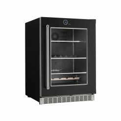 Two full-depth tempered glass shelves, one half-depth shelf, and one fixed shelf allow for the storage of large cartons, bottles, or open bottles of wine