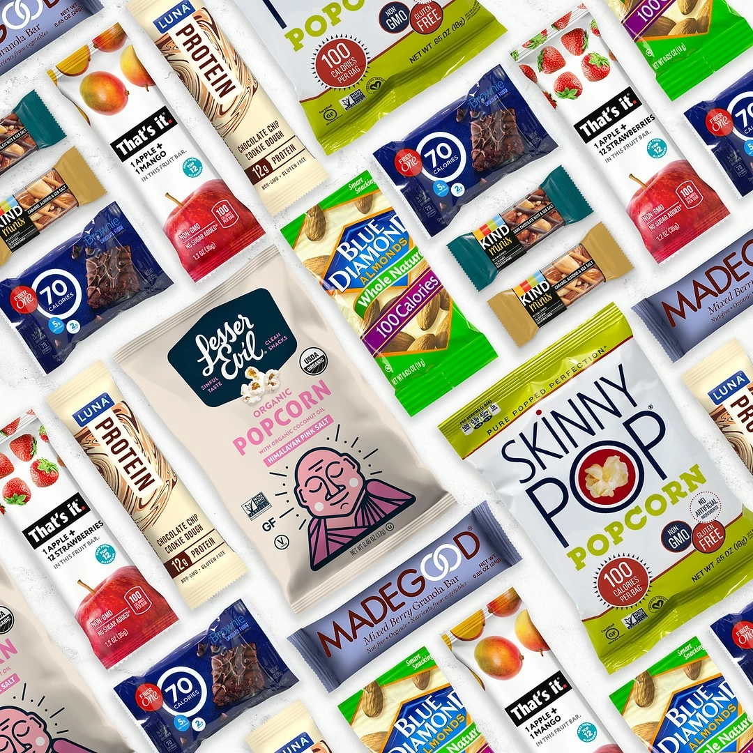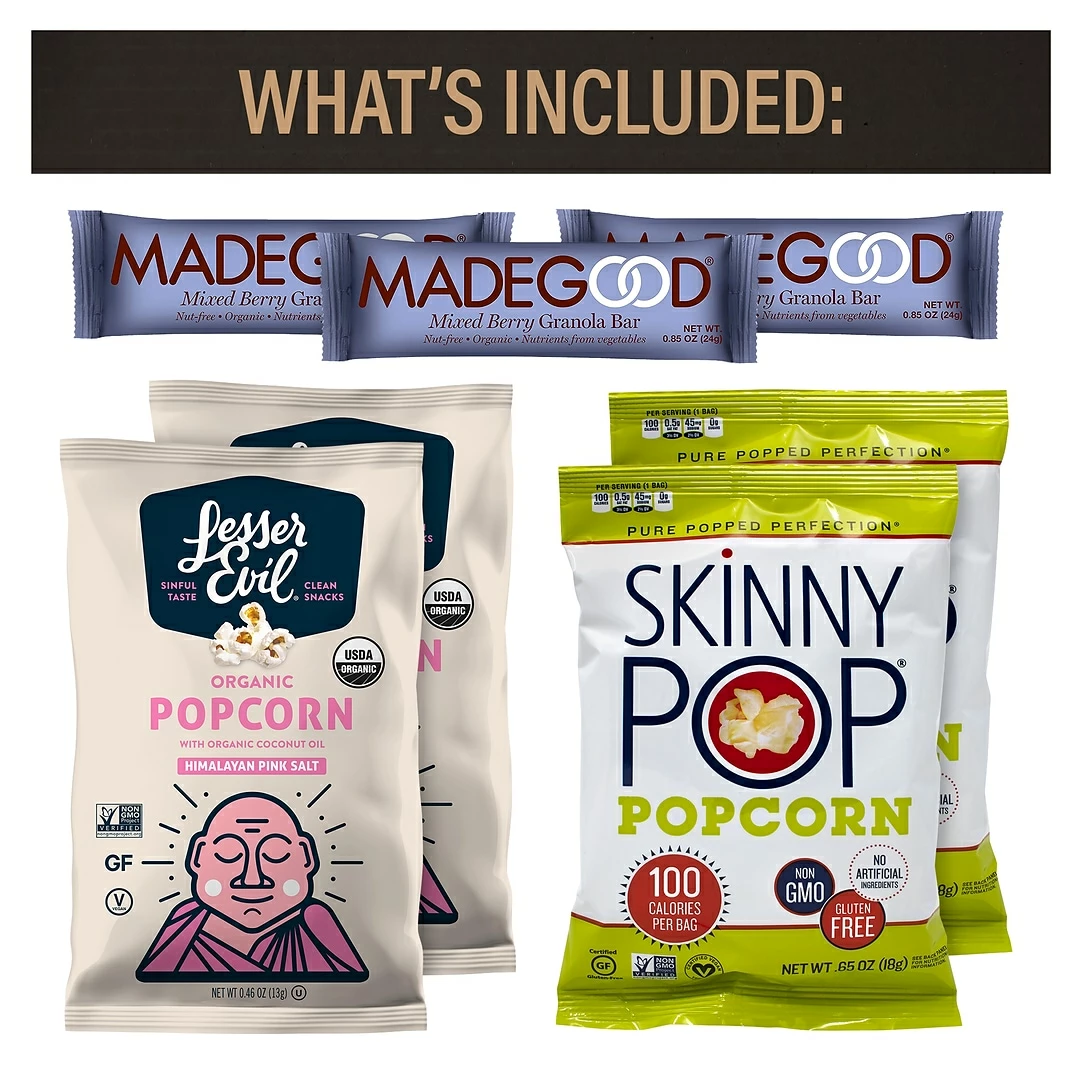 A total of 28 items and brands such as Skinny Pop, Lesser Evil, Luna, KIND, Fiber One, Made Good, Blue Diamond, and THAT’S IT.