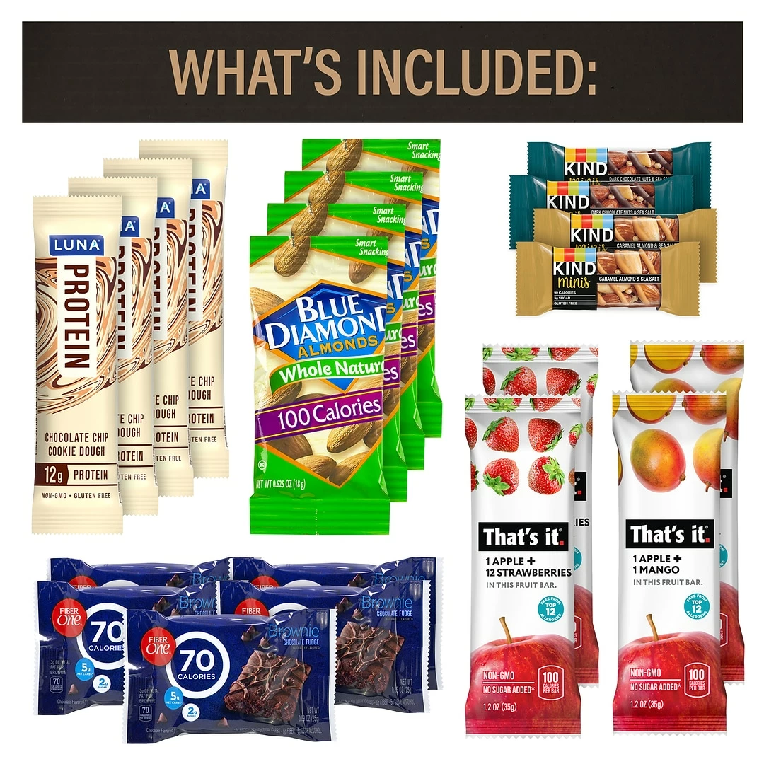 Looking to cut calories or snack healthier? This box has you covered! With brands like Skinny Pop, Lesser Evil, Luna, KIND, Fiber One, Made Good, Blue Diamond, and THAT’S IT. A wide range for everyone to enjoy and snacks to satisfy every preference. Low calorie doesn’t have to mean low on flavor; with brownies, bars, popcorn, and nuts there’s flavor for days! Grab a box and stock your pantry, office or break room.