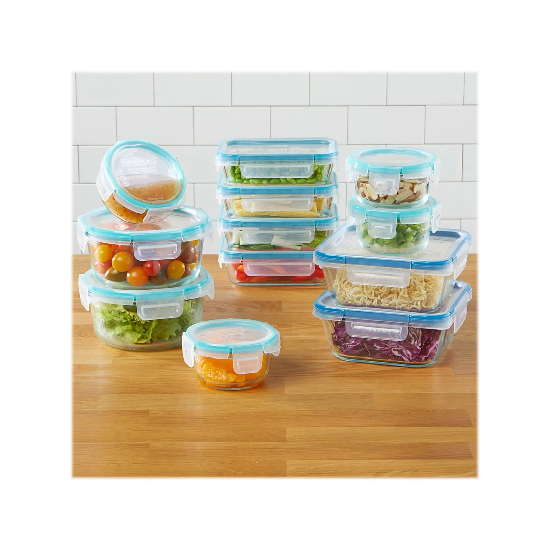 Good food is good to go, to office, freezer, fridge or cupboard, thanks to this container set with lock-in-place lids and durable Pyrex glass. The colorful plastic lids in this 24-piece Snapware set seal out air and prevent leaks. Just fill, label, stack, and then nest to store compactly till you need them again.