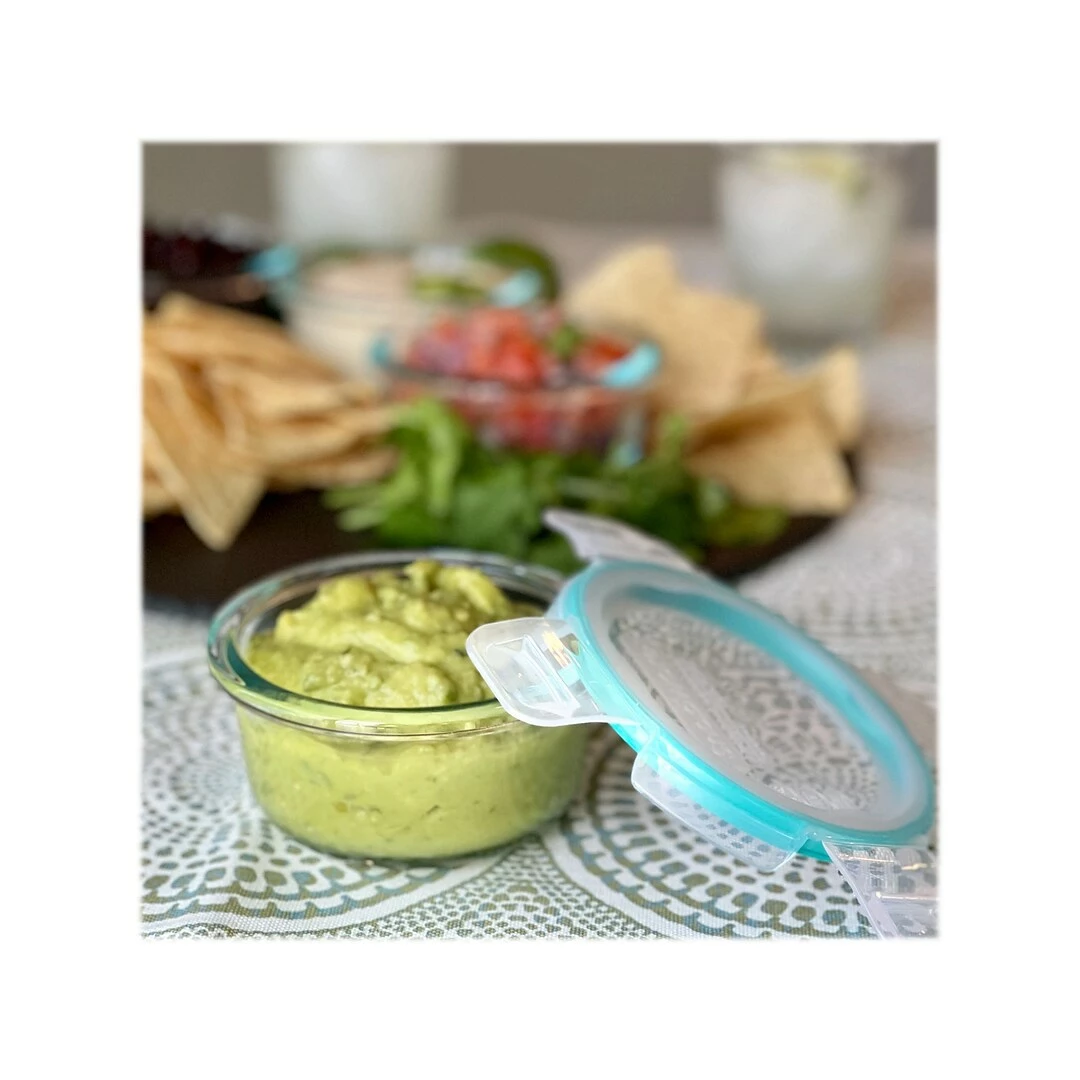Made of clear Pyrex glass with lightweight and durable BPA-free plastic lids with blue trims