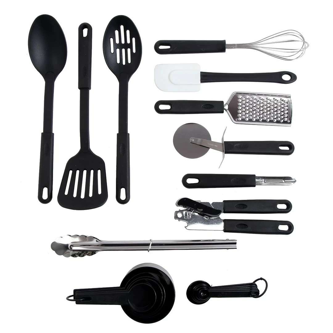 The Total Kitchen 20pc Kitchen Tool/Gadget prepare and serve Combo set is the perfect starter set for those newlyweds or your college student. It includes peeler, pizza cutter, can opener, whisker, grater, tong, solid turner, spoon, slotted spoon, spatula, 5pc measuring cup, 5pc measuring spoon. The set is dishwasher safe