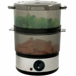 Trademark Stainless steel food steamer features a timer that goes from 0 to 60 minutes and an automatic shut-off. Steamer is made from stainless steel for durability and has two tray electric steamer.
