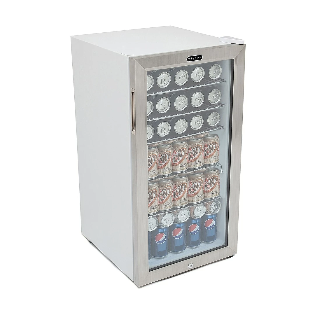 The Whynter 120 Can Beverage Refrigerator/Cooler offers a compact and powerful cooling solution ideal for your entertaining or retail merchandising needs.Unlike many budget beverage refrigerators, the Whynter 120 Can Stainless Steel Beverage Refrigerator utilizes premium features and design to provide a sleek showcase that will be centerpiece of any space. With its powerful compressor and internal air-cooled system, this beverage refrigerator creates an evenly-cooled space ensuring consistent temperatures throughout the beverage refrigerator.The stainless steel trimmed glass door and soft LED lighting allows you to see view the contents while maintaining internal temperatures and increasing energy efficiency. The Whynter 120 Can Stainless Steel Beverage Refrigerator is equipped with a lock to keep your beverages safe and secure. The door swing direction is also reversible for customization to your specific requirements.