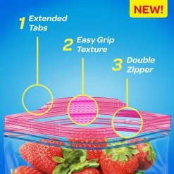 Ziploc brand Storage Bags are here to protect food and keep it fresh. Now with Easy Open Tabs, these bags are ideal for storing a wide variety of foods like fruit, vegetables, fish, meat, poultry, cheese, baked goods, cooked food, and leftovers. Our Smart Zip Plus Seal lets you feel, hear and see the bag close from edge-to-edge, so you can feel confident your food is protected.? Ideal for refrigerator food storage, packing healthy lunches, storing leftovers, and even organizing your desk or storing arts and crafts supplies.